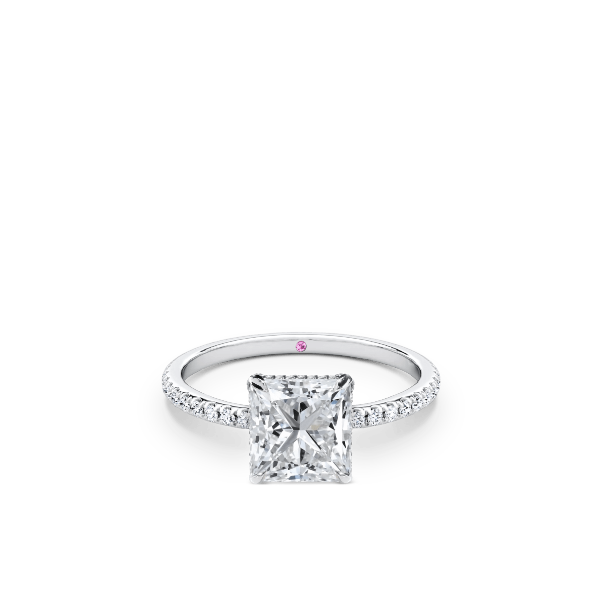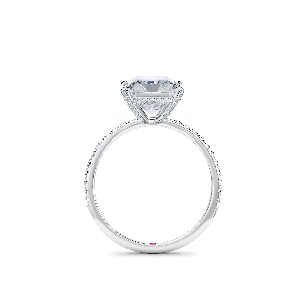 Close-up of a radiant-cut diamond engagement ring featuring a pavé diamond band in polished white gold. The centre stone's sharp facets are beautifully complemented by the intricate pavé detailing. A hidden pink diamond is set within the band, symbolising a unique and personal touch. The composition showcases the brilliance of the diamonds against a sleek, modern background, making this ring ideal for those seeking a luxurious and distinctive engagement ring design.