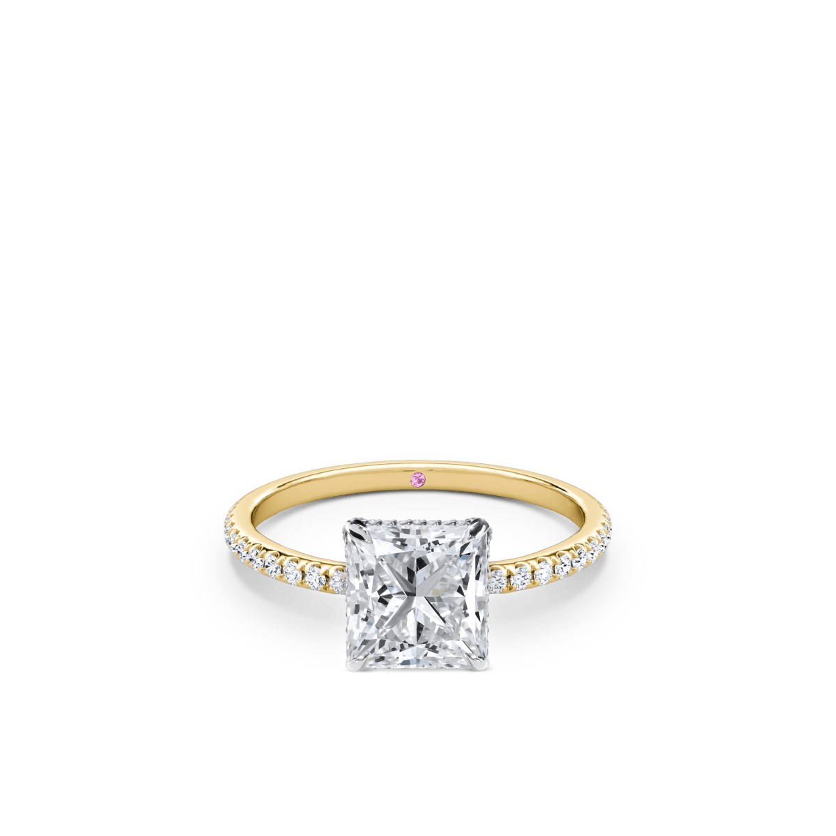 Close-up of a princess-cut diamond engagement ring featuring a pavé diamond band in polished white gold. The square centre stone is elegantly framed by the pavé-set diamonds along the band. A hidden pink diamond inside the band symbolises a rare and personal touch. The ring is displayed on a sleek, embossed MJ Jones surface, highlighting its modern yet timeless appeal. Ideal for those seeking a luxurious and distinctive engagement ring design.
